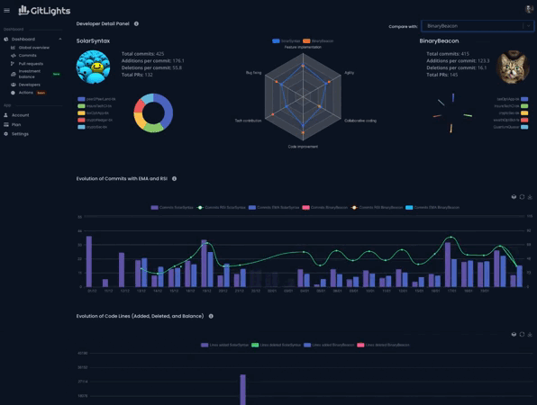 Discover the fascinating world of your GitHub repositories with our analytics dashboard. Visualize historical graphs that show added and deleted lines and the overall balance. Use advanced insights like RSI and EMA to assess your development team's performance. Make informed decisions based on developer comments, reviews, and conversations in pull requests. Filter by date, repository, or developer to obtain a comprehensive view!